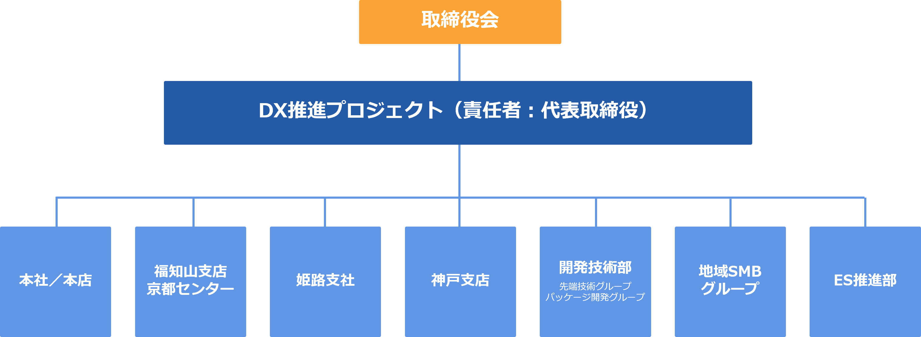 当社はDX戦略を実現するため、代表取締役を責任者とするDX推進プロジェクトと社内組織が連携しDX戦略を推進して参ります。