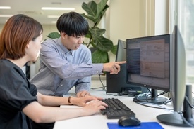 私は、学生時代は理学部数学科で数学を学んでいたため、パソコンについては何も知識がありませんでした。不安な部分もたくさん抱えたまま入社しましたが、入社後、3か月間の新入社員研修でパソコンやプログラミングなどの基礎知識をしっかり学び、社会人としてのマナーも身につけることができました。